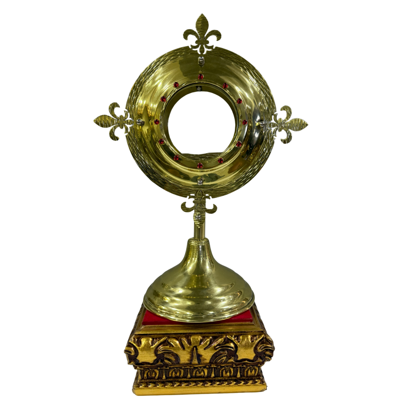 Ostensório de 36 cm, modelo Flor de Lis, fabricado em metal com banho de latão. Possui luneta para hóstia de 8 a 10 cm, ideal para pequenas capelas e comunidades.